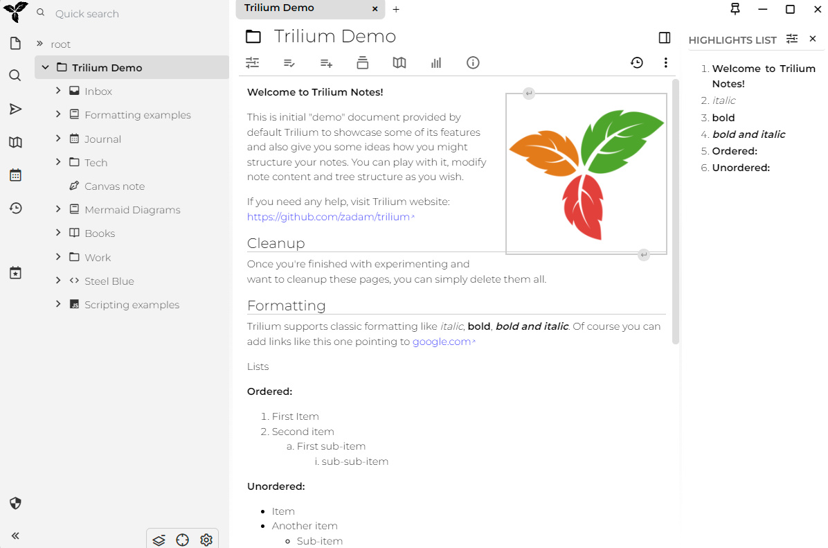 Trilium:功能強大的開源的個人知識管理工具,支持多端。主包沒有深度體驗過,但是哪怕作爲一個普通的筆記軟件也是很不錯的。部分強力功能如下: