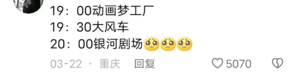 黄金档的《动画梦工厂》被改到周六早上7点播出,《银河剧场》的重播时间延后为工作日的夜间8点55分。