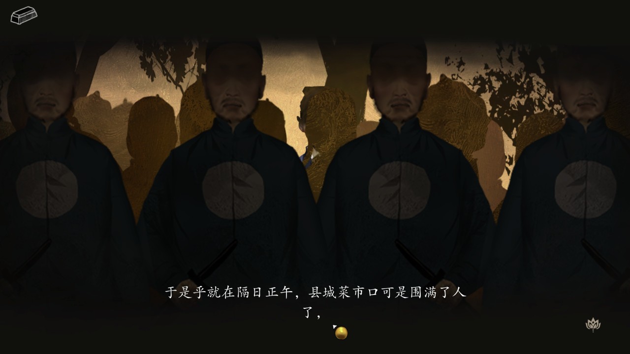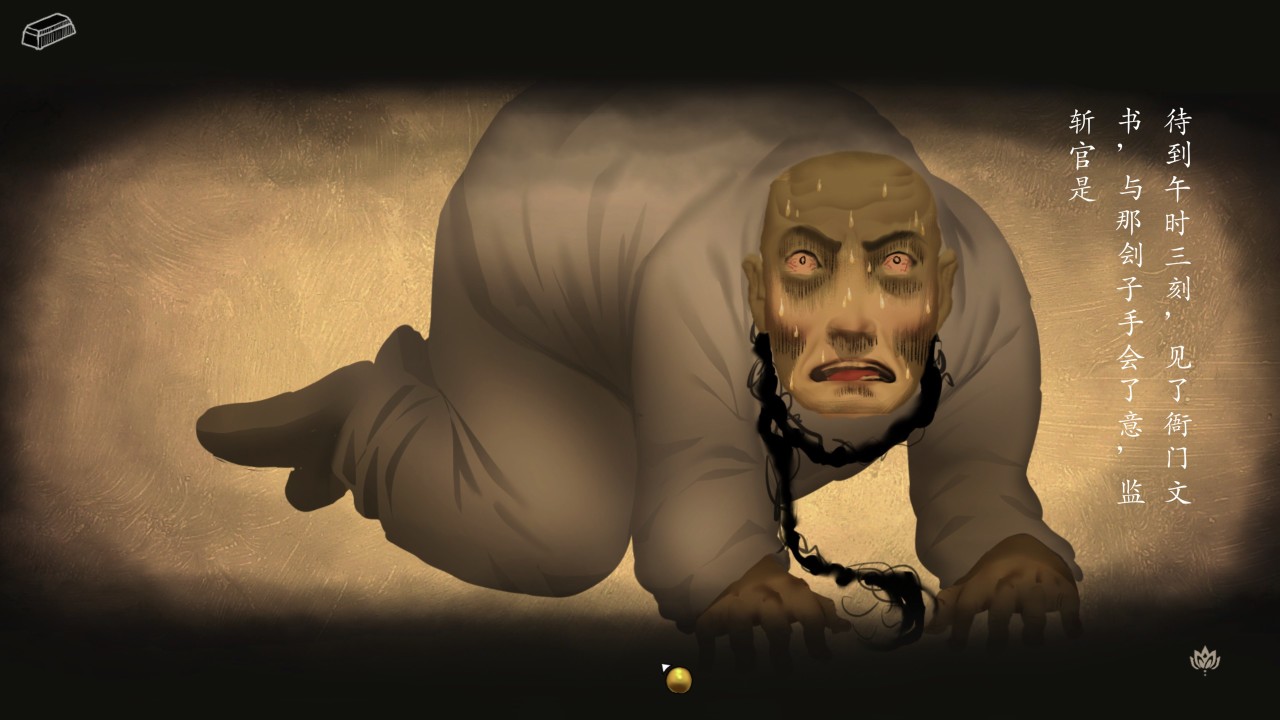 從第三人稱切換到第一人稱,視野越來越小,哽咽聲越來越近。旁白字幕按照古文書寫格式從右往左的橫排顯示,而人物的字幕自帶書頁背景,給人一種看小說的既視感。