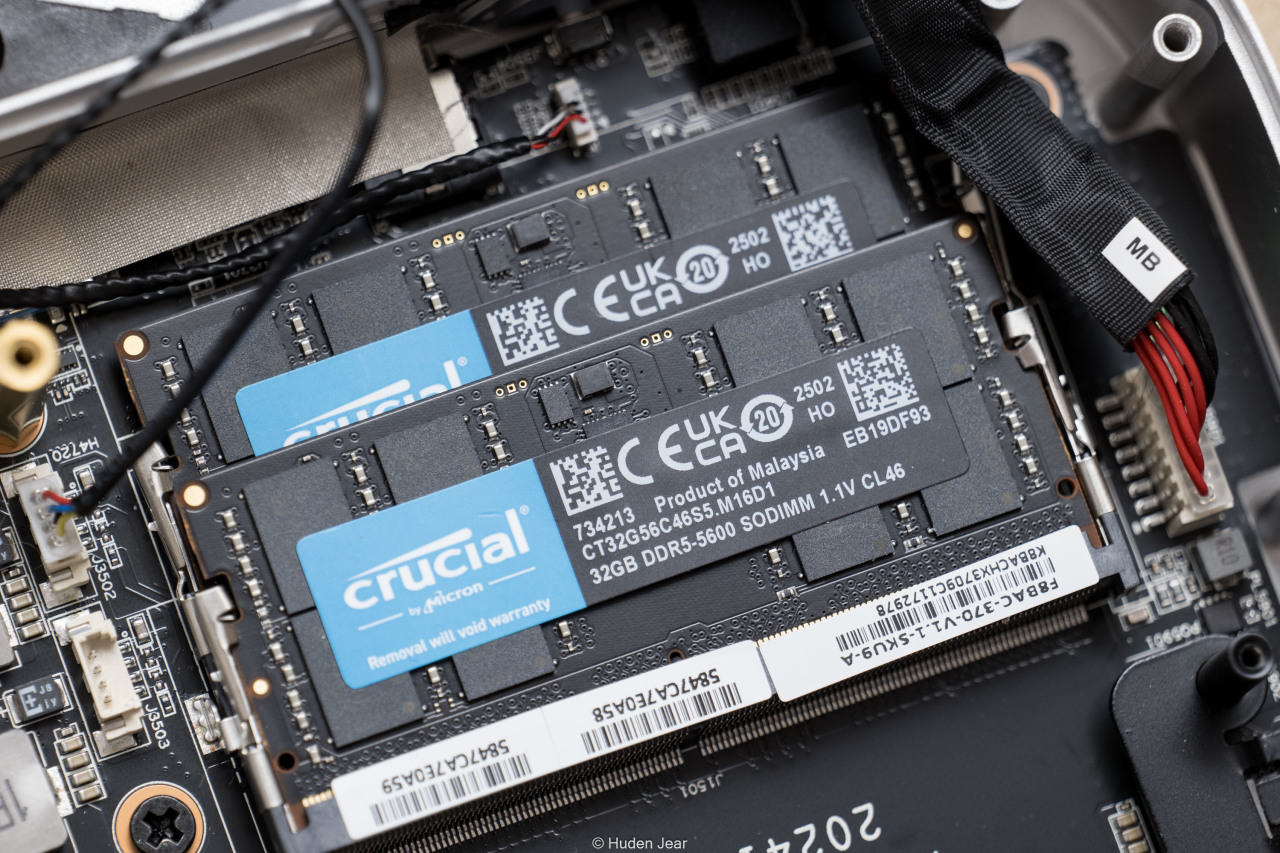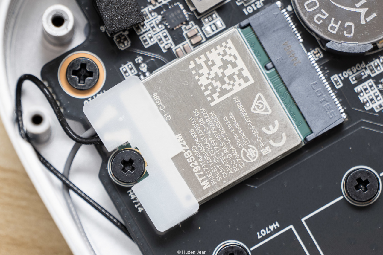 主机自带的内存是DDR5 Sodimm的 5600MHz CL46 1.1V,很中庸的频率和电压,容量则是32GBx2,非常充裕。而铭凡AI X1 Pro最大能支持128GB的内存,对AI推理就很方便了。主机使用了MT7925的wifi模块,自带的硬盘为1T的P3 Plus,有一个自带的散热,自己安装硬盘的时候也可以安装附赠的散热