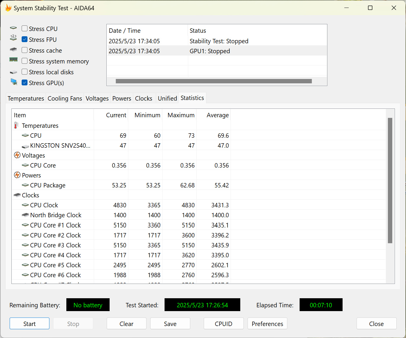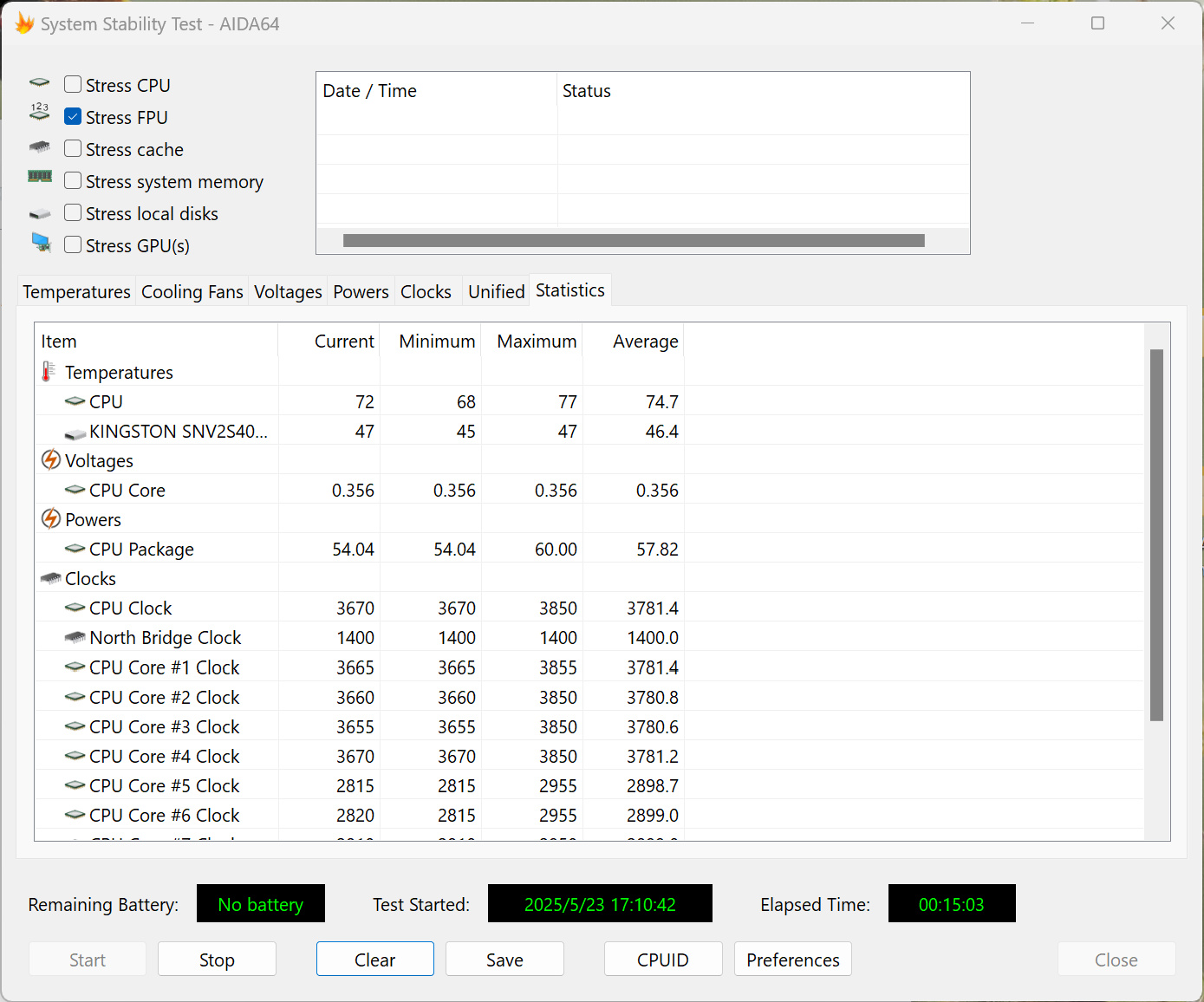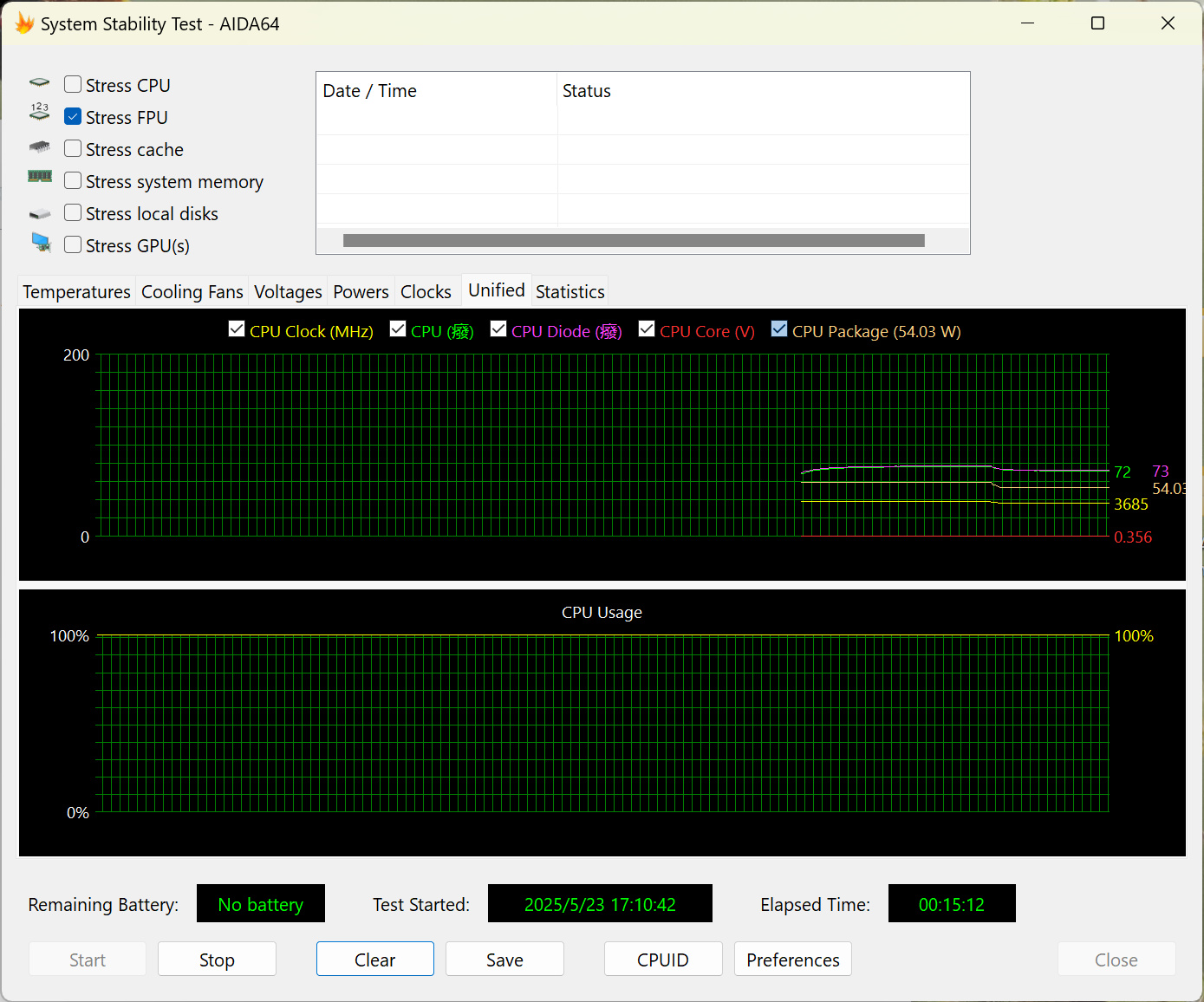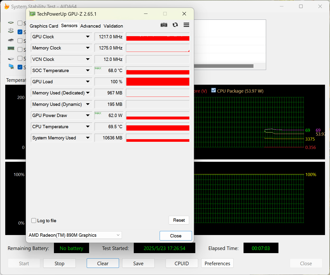 烤机测试算是AI X1 Pro的一个强项了。如上面拆解的时候展示的,这个机器的散热模组做的非常不错,而HX370的功耗被控制在60W,所以散热对于这台机器基本就是小菜一碟,温度轻松压在74℃左右,长期稳定功耗在55W。而如果加上显卡一起烤机,那么整体功耗回来到65W,但是因为显卡高占用时机器策略会更加激进,同时热量分布更加均匀了,所以烤机温度比单CPU更低,只有70℃