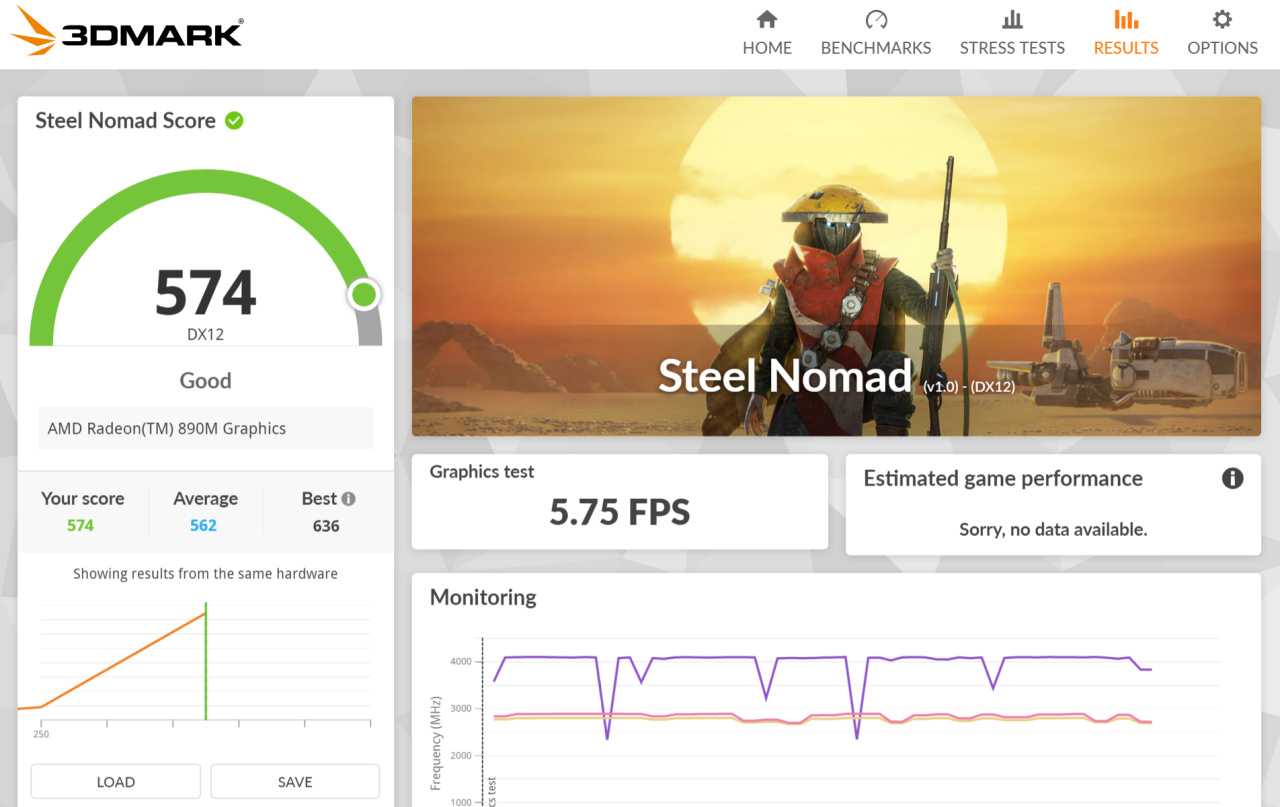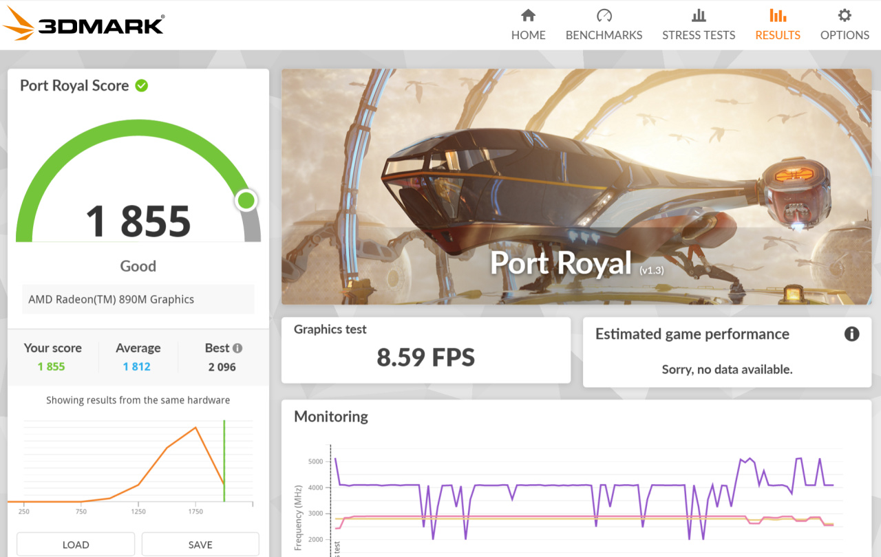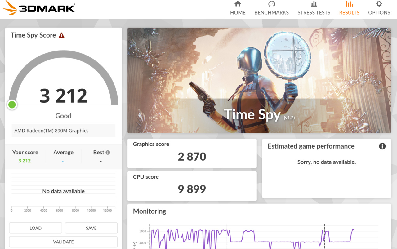 3Dmark的表现如下,虽然890M是核显,但是得到了大容量内存和不错的带宽延迟加成下,表现仍然可圈可点,而且这个核显还支持光追,在TimeSpy中得分接近3000,如果是玩一些性能需求不高的游戏完全足够,比如lol或者彩虹六号。