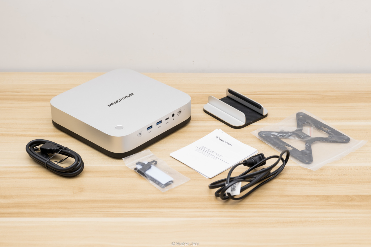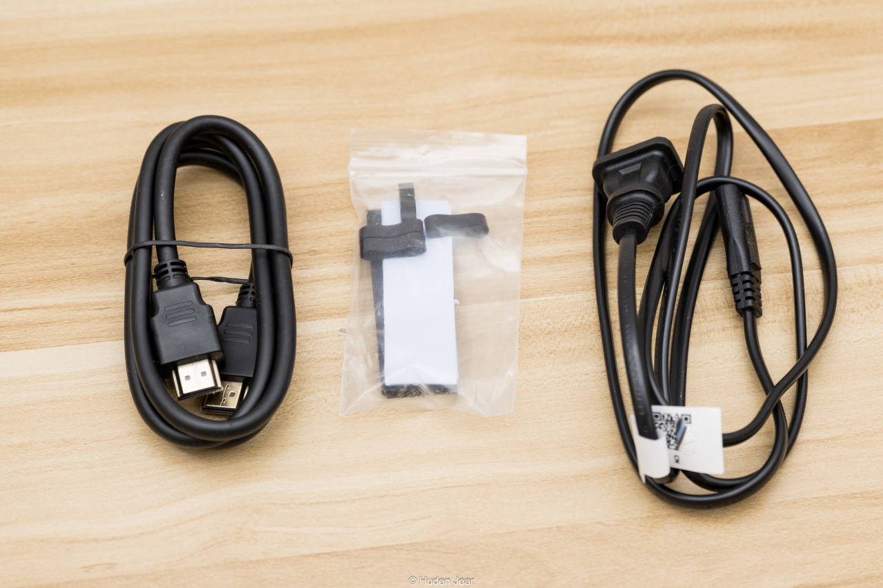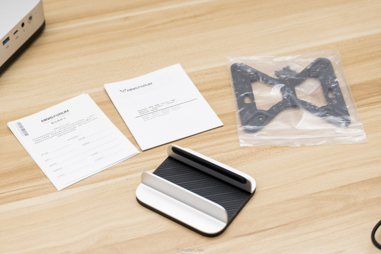 开箱之后配件很丰富,有电源线和HDMI线,还有M2散热器以及壁挂支架。这个机器还专门附送了支架,可以竖放。可以看到配件里并没有电源适配器,因为电源已经内置,只需要插一根二孔的电源线即可运行