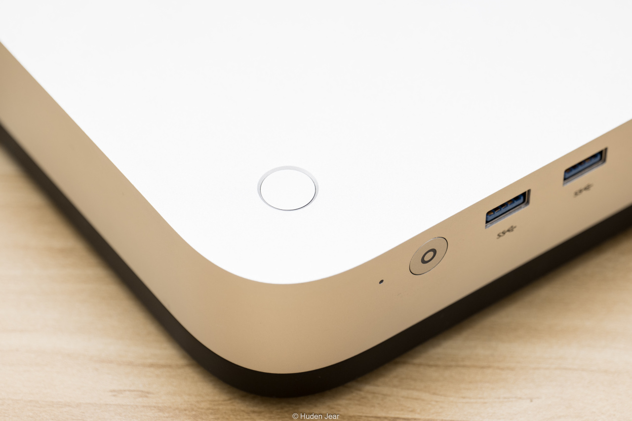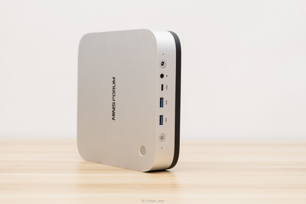 铭凡AI X1 Pro的主体为银色+黑色主体,四个角使用圆弧形,而立面之间则是垂直折角,俭约但是做工很棒。前面靠左有一个圆形区域,这个是指纹识别模块,正面的IO则有两个USB-A一个TypeC,一个3.5耳机孔,非常丰富。正面有两个小孔,是收音孔,内置麦克风可以直接用它来开线上会议