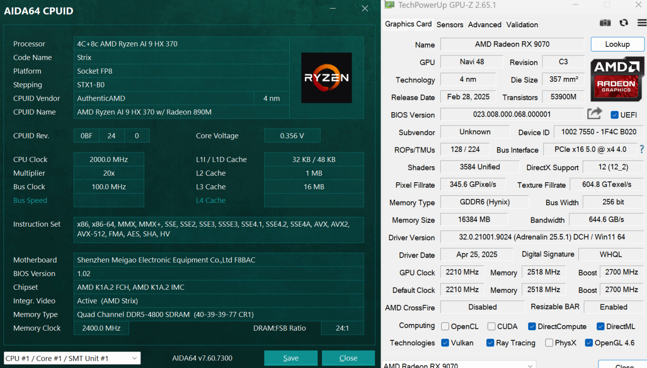 下面是测试环节,首先是CPUID和GPUZ信息,AI X1 Pro的CPU是目前AMD最新一代的AI HX处理器,AI HX9 370,这个CPU使用了4C+8c的构架,规格上不弱。同时这个CPU也有一个相当不错的核显890M,Shader数量达到1024cus,规模相当大了,仍然使用内存作为显存,因此对LLM模型的支持不错