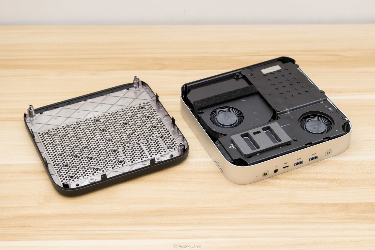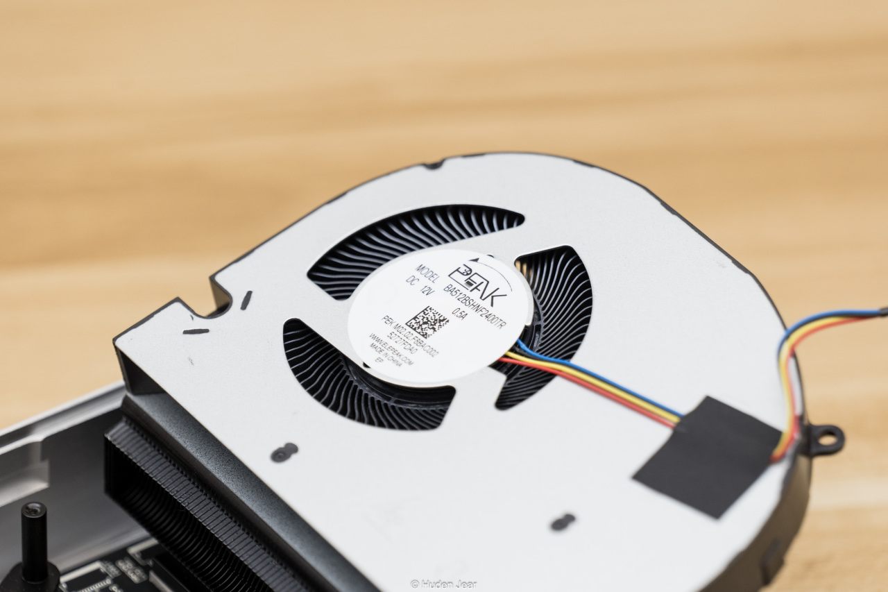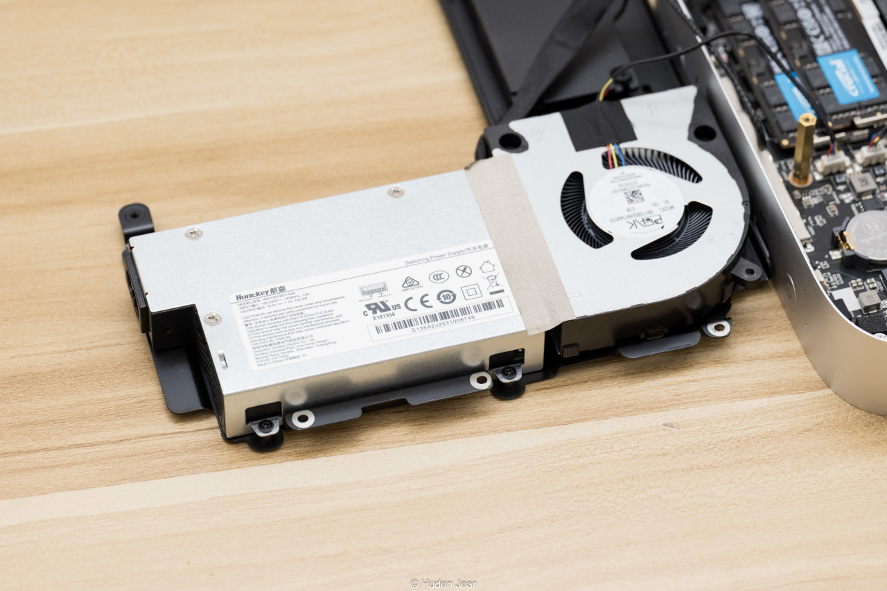 打开后盖之后可以看到主机庞大的散热模组,分为主板电源散热和CPU散热,同时也可以看到扩音单元