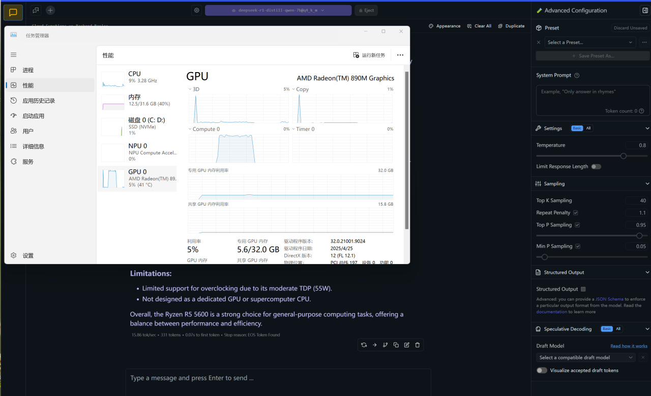 还有AI性能测试,使用SD的AI绘图512x512分辨率20轮迭代大约40s一张,0.5迭代每秒的速度勉强可用了。不过使用大语言模型就要轻松很多了,DeepSeekR1 7B的Q4模型,HX370可以轻松跑上15tps,响应速度也不错,此时是用的还是GPU,如果以后有NPU的oLlama可能会更快