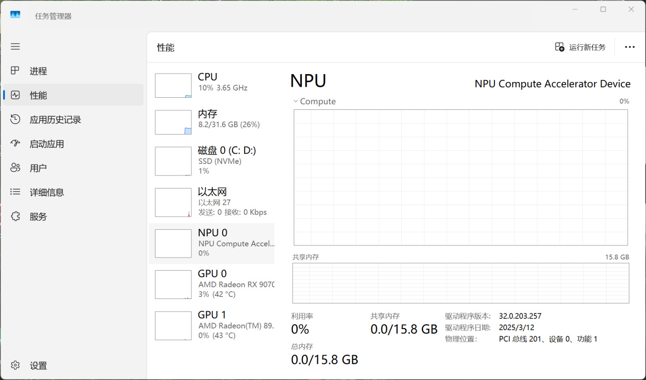 内存使用了英睿达的32Gx2 5600Mhz,所以容量方便完全不成问题,带宽也是接近桌面级的5600MHz的水平,延迟表现92ns,在移动端算是相当不错的。AI 9 HX 370内置一个NPU,算力比显卡稍高,作为独立的LLM加速核心也足够用了
