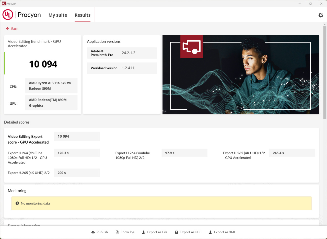 在具体应用的测试上,比如Procyon的 Adobe Pr测试,AI X1 Pro的表现也还不错,视频编码得分10000+,剪视频的性能不错的。而Specworkstation的测试表明HX 370的性能能满足绝大部分科学计算软件的需求