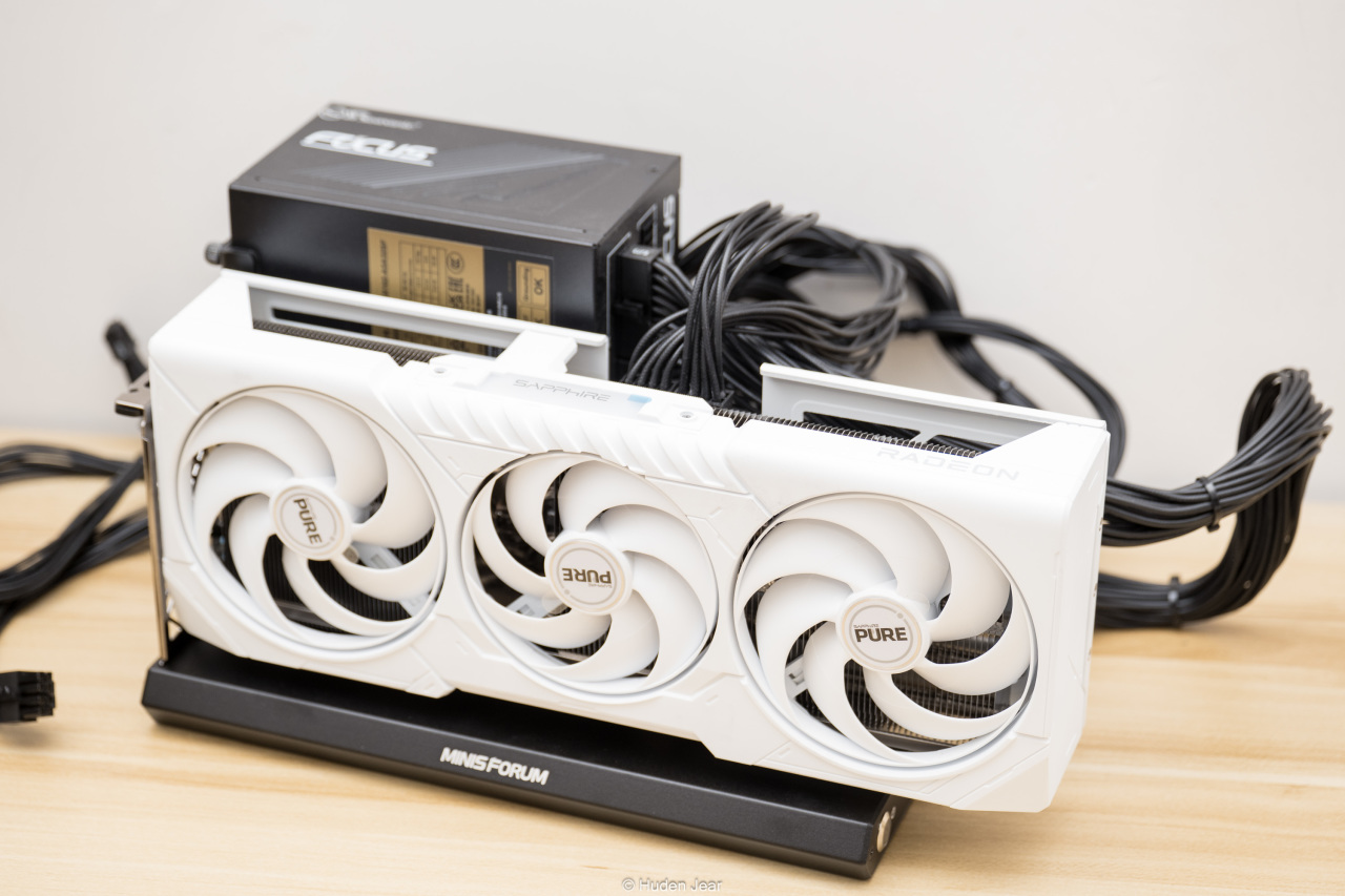这个显卡扩展坞的做工还不错,有独立开关和电源以及显卡的固定螺孔,整体结构强度很高,接口朝向的设计也合理,电源线、视频线和oculink都是一个方向。本次测试的显卡是RX 9070 16G 极地版,也是AMD目前这一代的次旗舰了