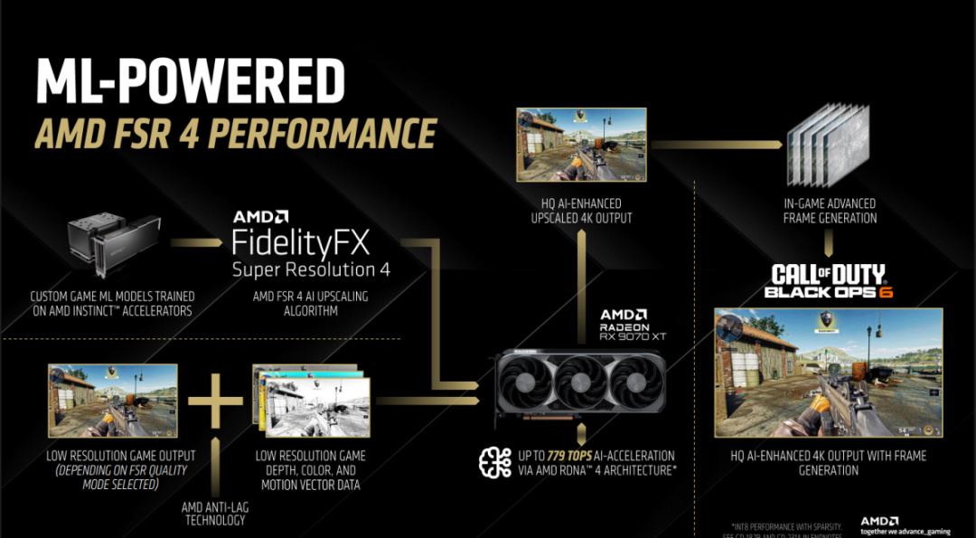 FSR4需要RDNA4架構中的專用AI加速器支持,該加速器能夠高效處理複雜的機器學習模型,這是實現FSR4高質量超分辨率和幀生成等功能的關鍵。