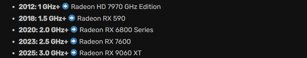 AMD是第一家推出1.0GHz顯卡的公司,當年Tahiti架構的Radeon HD 7970達到了1000MHz,公司還爲其專門推出了“GHz”版本。當然這只是AMD的里程碑之一,從2012年起,AMD便一直在圖形處理器上的保持着最高頻率紀錄。