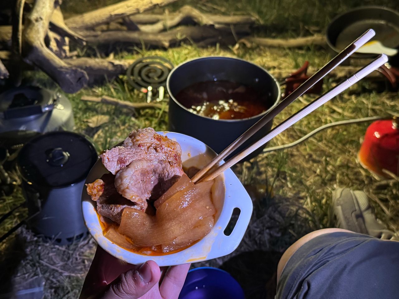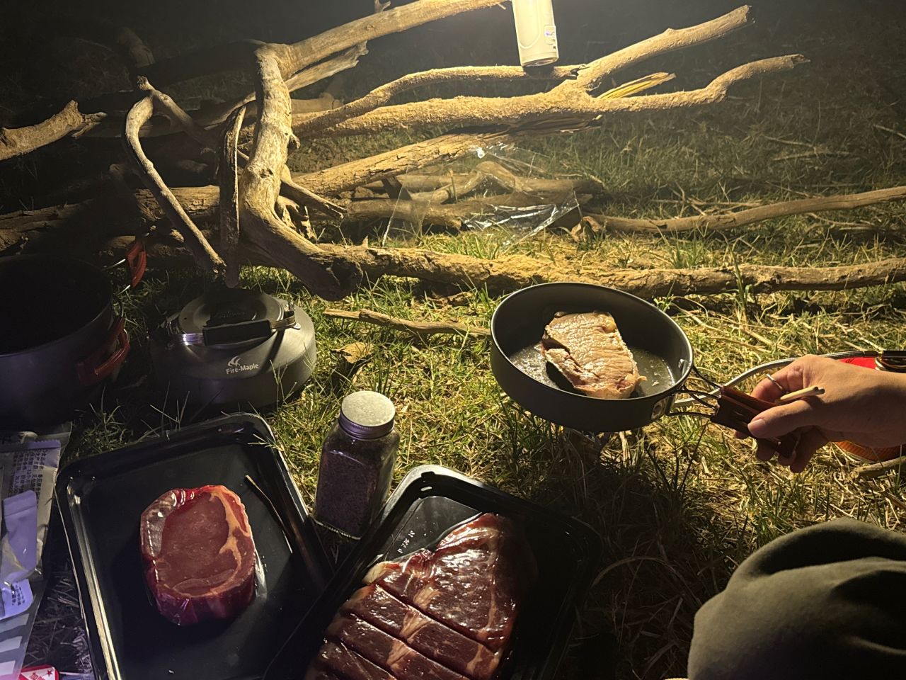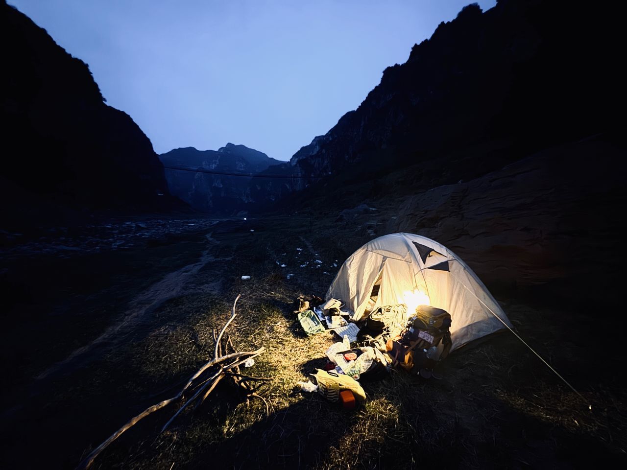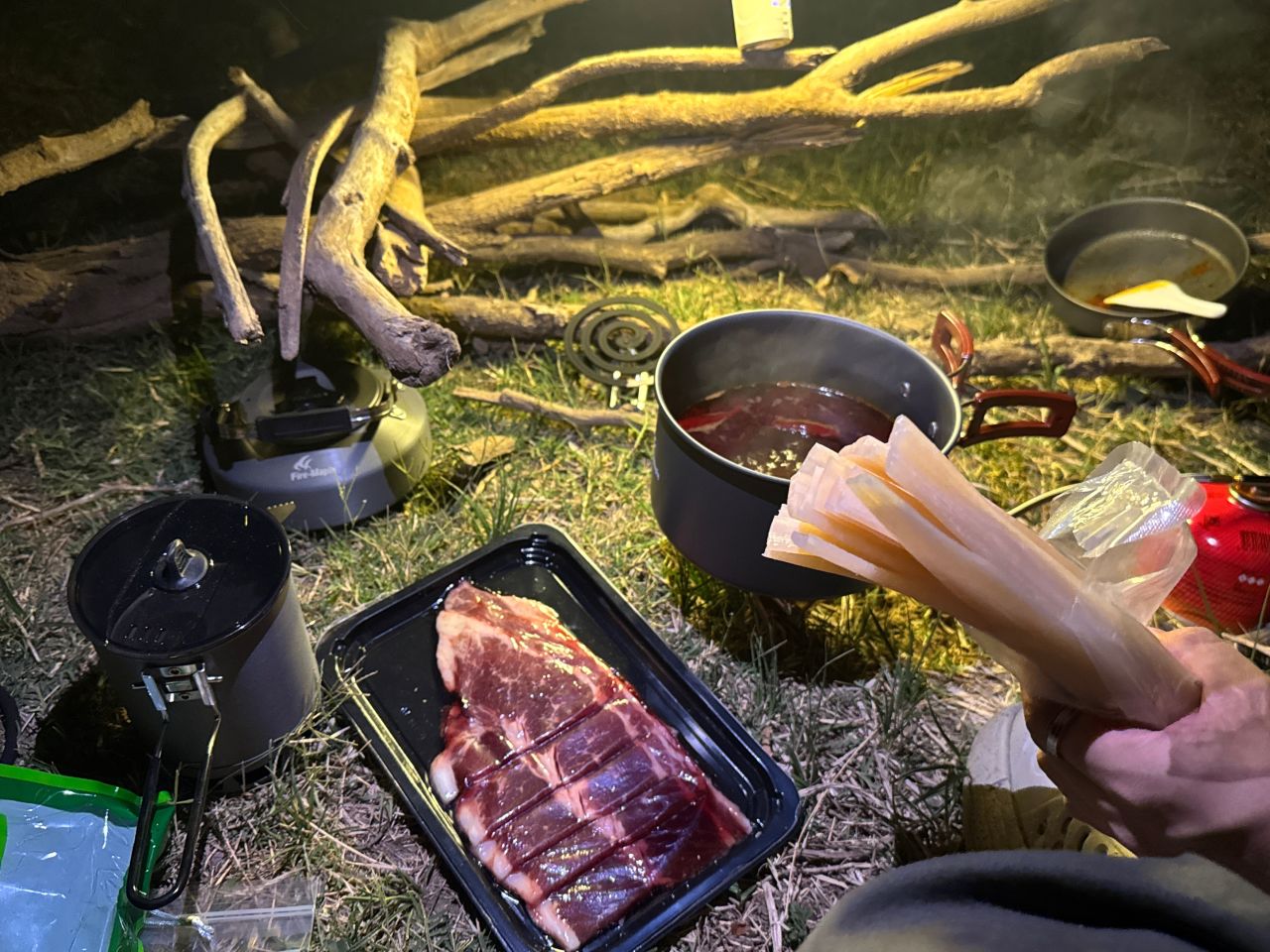 昨晚是走到河谷扎营,然后吃火锅牛排馄炖面,很幸福啊啊啊啊,我因为比较菜不咋能背,一般背泡面和冲泡米饭这些不太重的上山吃这次队友太厉害了背了好多食材!