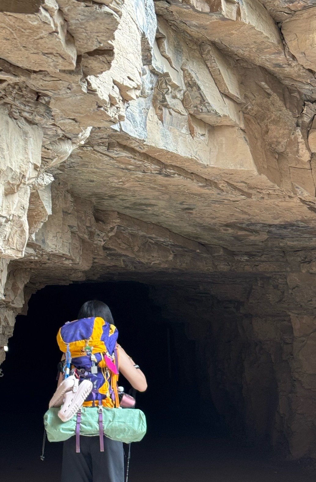 嘿嘿,队友在洞这边给我拍的!其实本来想穿长袖速干衣,但是实在是太热了受不了了就穿的背心(穿背心小心蚊虫和树枝什么的挂伤)猫猫是真的热的遭不住了所以这样穿裤子仍然是速干大裤衩,这种黑的地方一定要带头灯!注意安全www