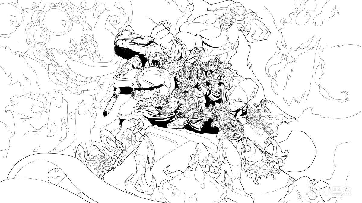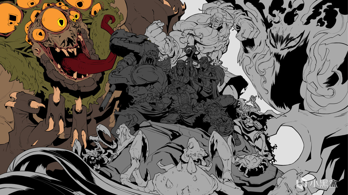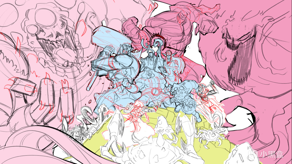 最后,再分享有关《死而符生》游戏海报的设计过程——勇者小队正面临着黑暗爪牙的围攻!