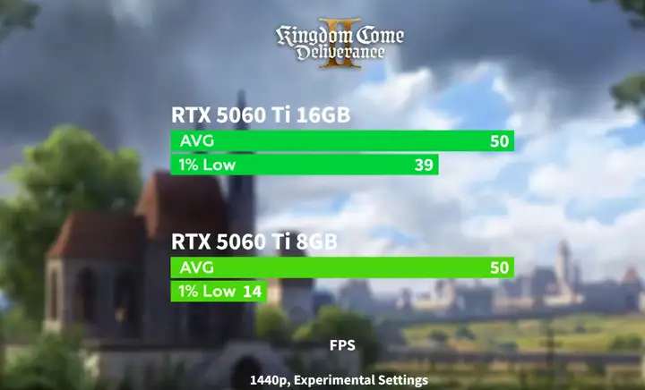 个别特别吃显存的游戏,LOW帧表现不如16G版本的5060TI,像显存鲨手怪物猎人荒野、天国拯救2等: