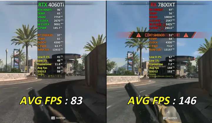 2K画质下2077中,7800XT比5060TI直接强一个量级