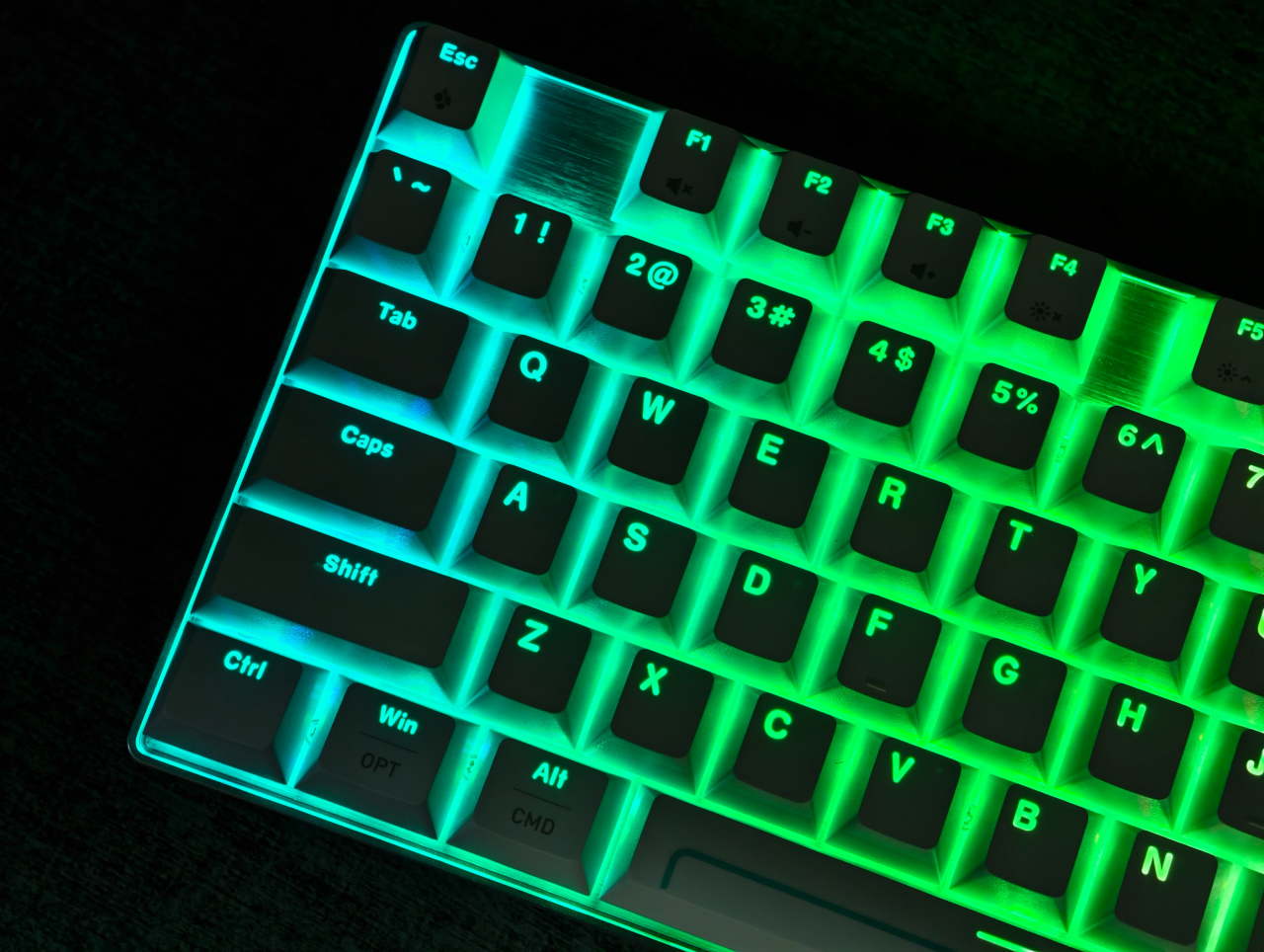說到軸體,順便聊聊鍵帽,這個價位必須得是PBT材質,做工上佳,毫無水口痕跡,並且本身按鍵上的字符采用類似側刻鍵帽的蝕刻工藝,燈光可透過。