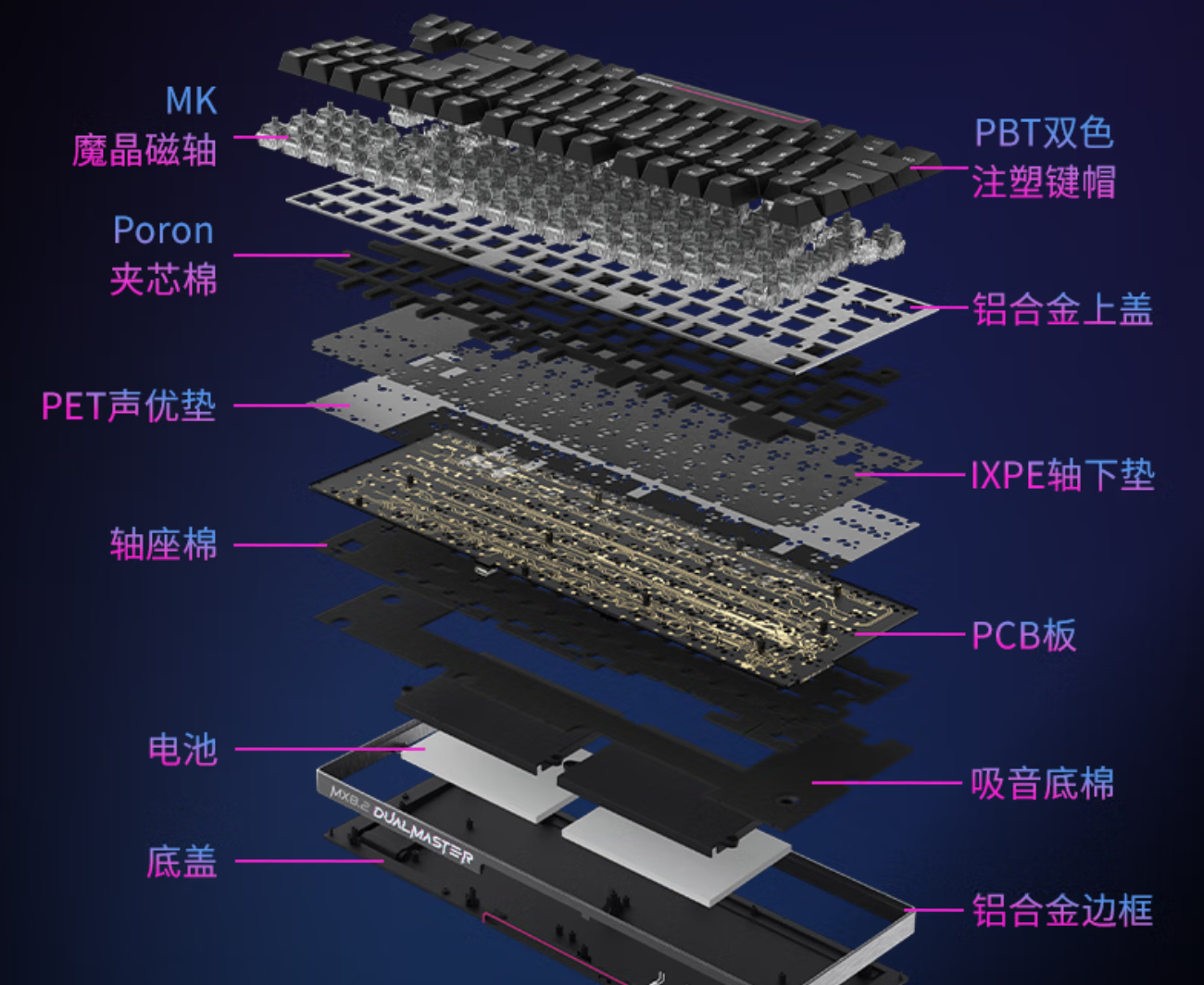 其定位板支持MX/MK軸體熱插拔,整上一套MX軸體,即可實現磁軸/機械軸相互切換,這下就不會有人吐槽——磁軸鍵盤手感爛,沒法碼字了。