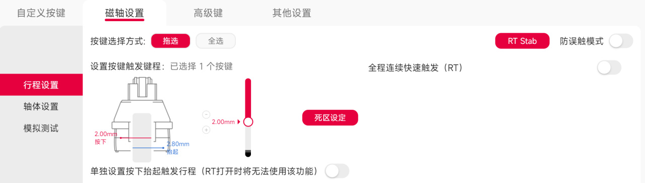 功能方面,磁軸的單鍵設定,包括死區、自定義RT行程等功能齊全,也可映射到全局。