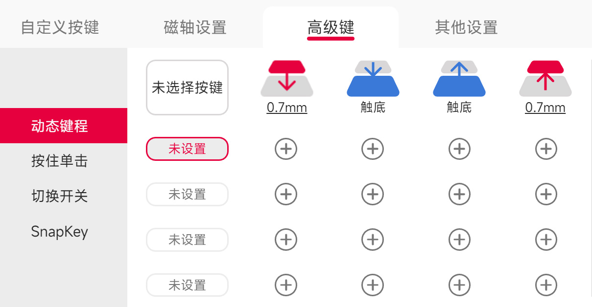 一些比較特有的功能被集成在“高級鍵”中,例如動態鍵程等功能,這裏便不贅述。