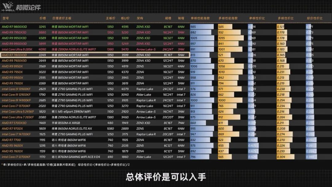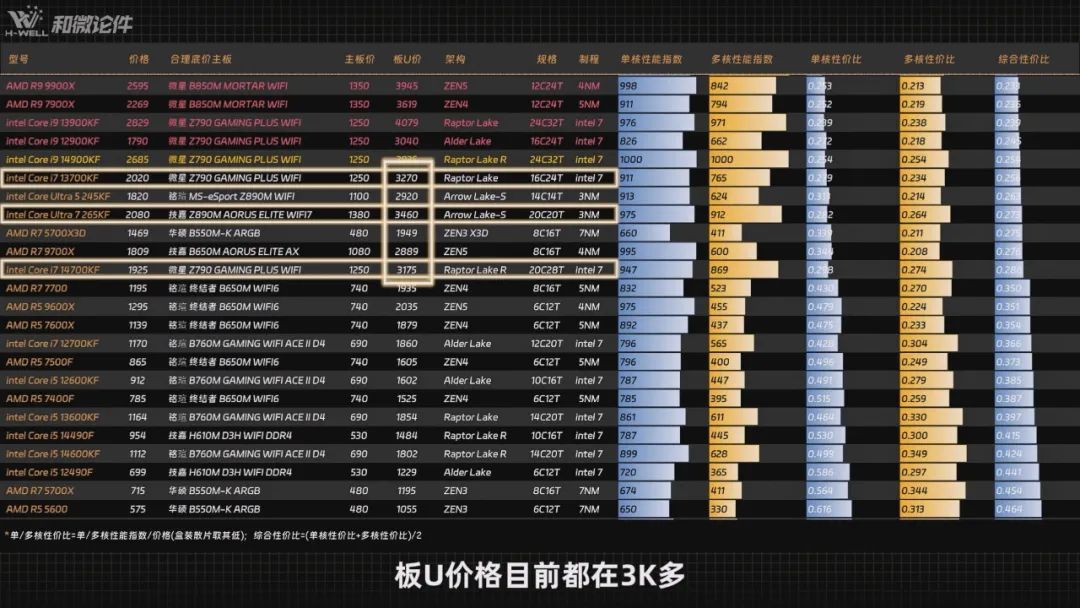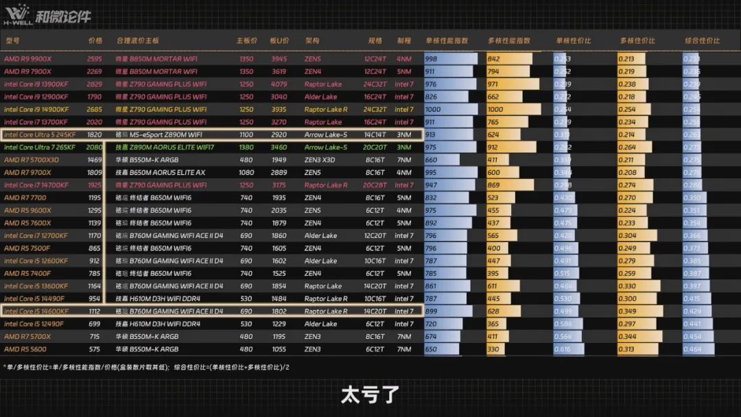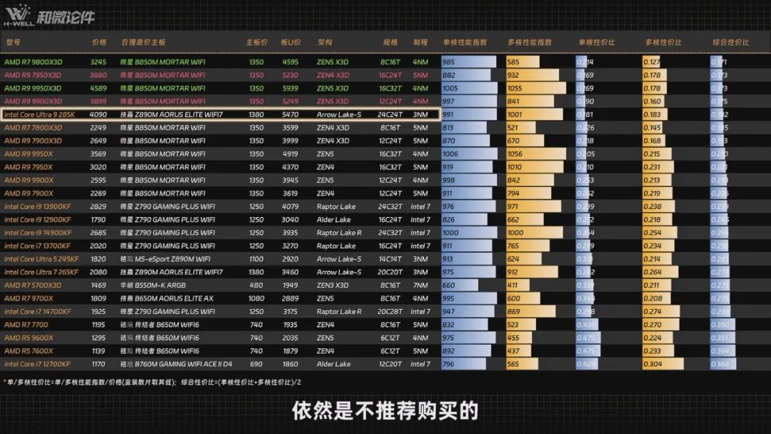 ULTRA 9 285K,虽然本期因为更换主板,性价比提升了一些,依然是不推荐购买的,跟对手比,同定位的9950X是全大核,价格还更便宜,跟自己比,265K仅仅少了4个小核心,价格只有它的一半左右,所以就算是更换了更便宜的主板,也是极度不推荐入手的。
