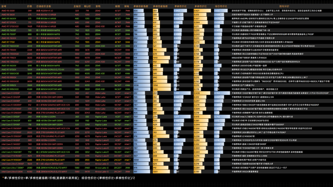 首先是 9800X3D,他的性价比指数排在倒数第一,不算出乎意料,因为他本就不是以单核多核性能为生,3D VCACHE的游戏性能无法在本表中体现出来。对于98X3D的评级是,可以购买,是目前的最强游戏CPU,而且价格也几乎来到了历史新低,叠券甚至可以2开头入手。