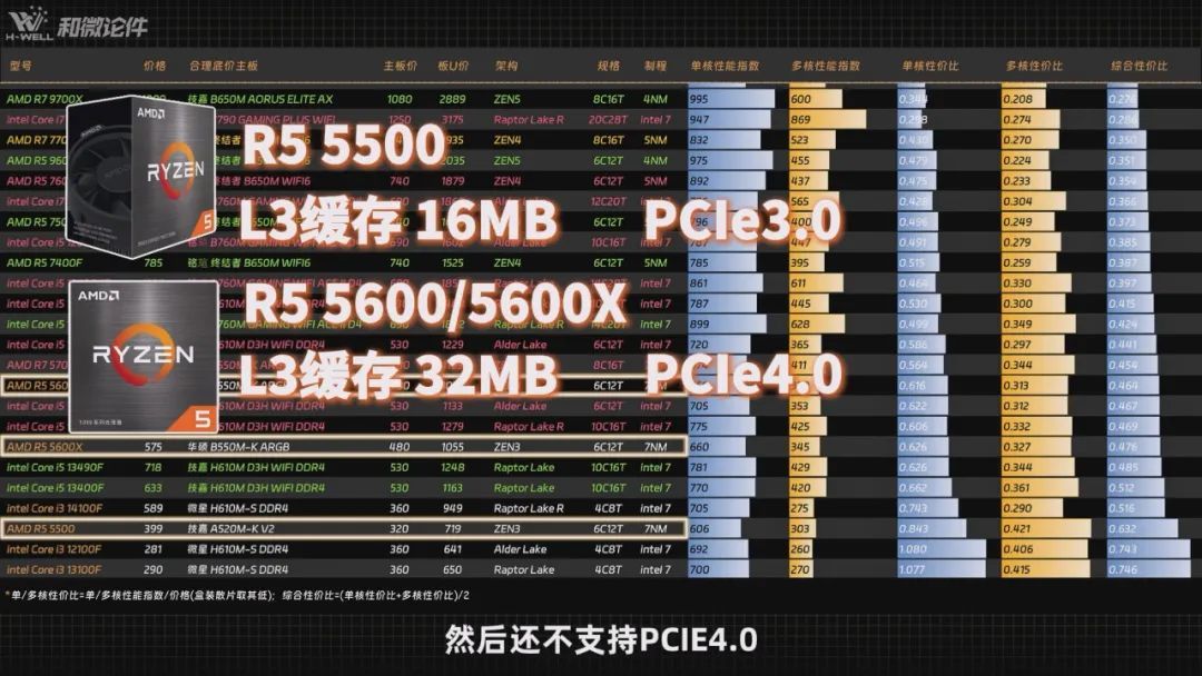 5600、5600X与5500,看似他们仨核心线程数一样,实际也一样,但是里面的差别可大了,5500相比5600与5600X,砍掉了一半的三级缓存,游戏性能先弱一大截。然后还不支持PCIE4.0,导致它的定位比较尬尴,那些最适合它这个价位CPU的显卡,诸如6500XT、6650XT这类的,PCIE通道都是4.0X4或者X8,与5500搭配,降速到3.0,性能跑不满。