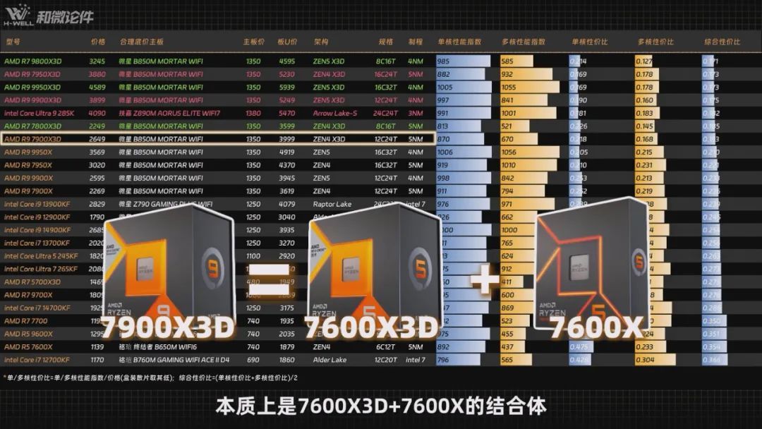 7900X3D,本质上是7600X3D+7600X的结合体,游戏性能打不过7800X3D,甚至曾经价格与7800X3D出现过一段时间的倒挂都没人买,现在价格比7800X3D还高了,更不值得购买了。