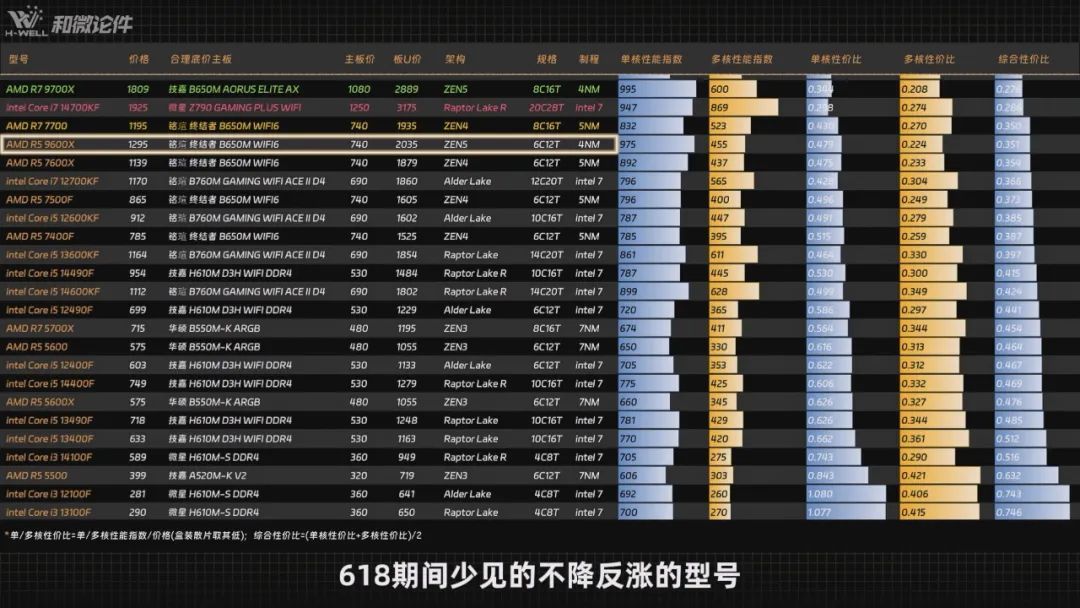 9600X,1300左右,618期间少见的不降反涨的型号,史低1100出头,但是奈何同价位游戏性能真没对手,甚至非常接近9700X,捏着鼻子也只能入了。