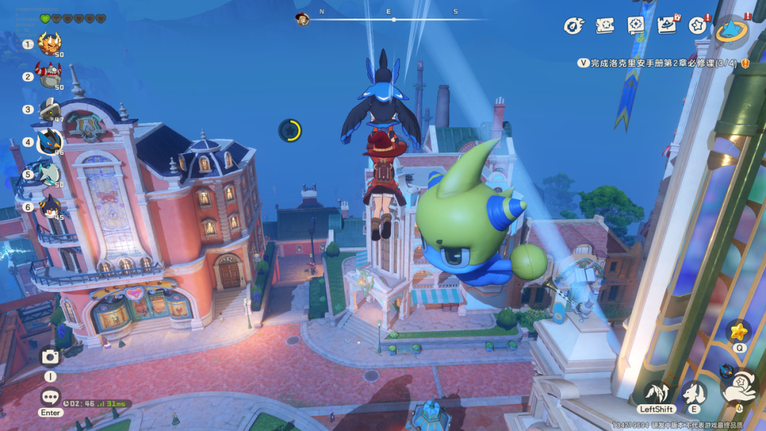 与人的交互上,精灵可以充当多重载具,精灵可以帮助玩家骑着走,飞着走,抱着走,水里走,甚至用钩锁飞檐走壁。