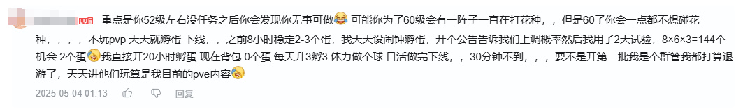 《洛克王国世界》更大的问题,是游戏长草期过早到来,一方面是现有的PVE内容里,世界BOSS挑战没什么难度,挑战稀兽花种时的组队AI队友甚至会帮倒忙,难度和内容量都不够。所以才会出现“50级之前觉得任务无聊,50级后连任务都没了”的无力感。