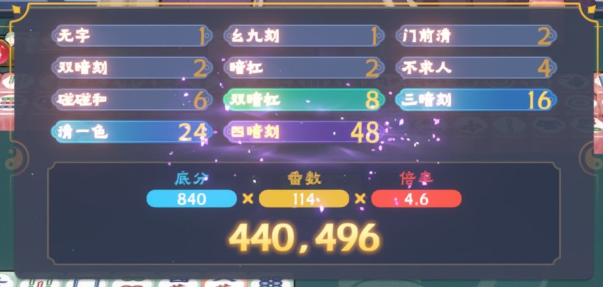 在清一色的基础上,叠加全求人、四暗刻、同顺节高步高,番数叠加得分爆炸