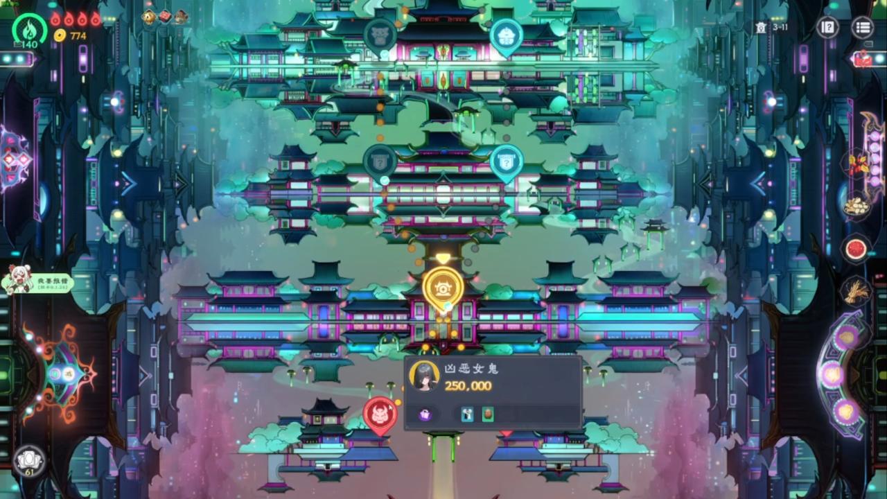 游戏地图则是经典的肉鸽爬塔设计,不同路线上分布着牌灵房、商店、灵佣房、道具房、奇遇房和BOSS房等不同房间。