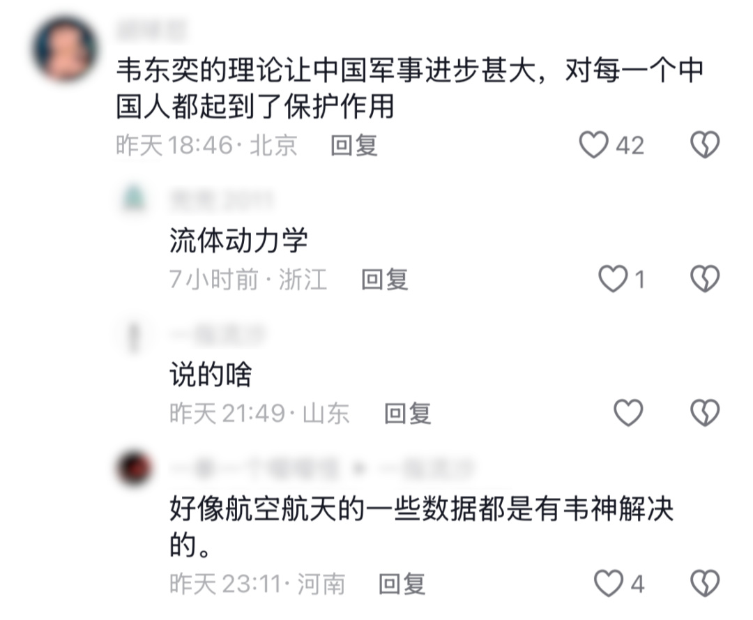 有人說,韋東奕的理論讓中國軍事力量進步甚大,對每一箇中國人都起到了保護作用 。