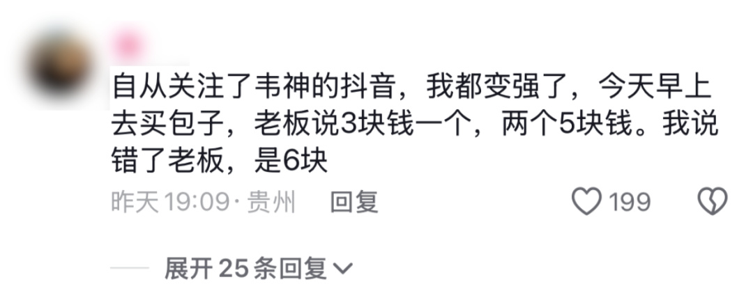 還有人說自從關注韋神後,3 塊錢 1 個,5 塊錢 2 個的包子,他都會說老闆算錯了,是 6 塊。