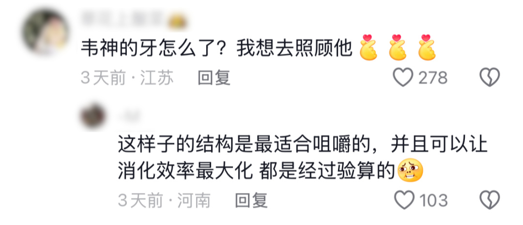 比如韋神的牙口不是不好,那是他驗算過了:這是最適合咀嚼,最大化消化效率的結構。