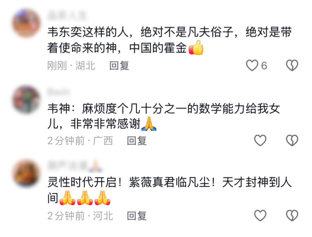 有人說韋東奕是帶着使命來的神,也有人希望他能度個幾十分之一的數學能力給他女兒,甚至有人認爲自己刷到了韋神,這是一種好的預兆。