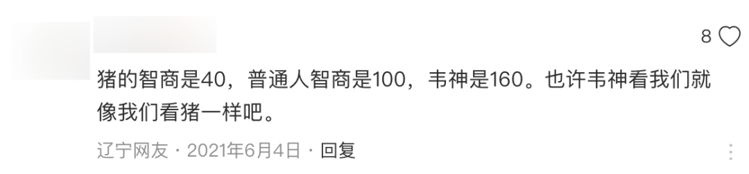 還有網友算了一下,豬的智商是 40,普通人智商是 100,韋神是 160,最後得出韋神看我們就像我們看豬一樣。
