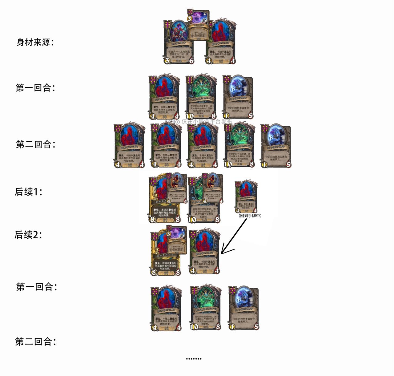 利用亡靈馬復生後仍然具有所有特效的特性,用克爾蘇加德回合結束消滅亡靈馬觸發復生站場,再配合附魔師的翻倍回合結束效果提高效率,當場上有三個普通亡靈馬時回手三連,從而實現身材翻三倍,再用克爾蘇加德進行消滅實現滿場亡靈馬。