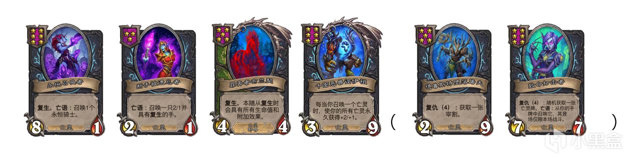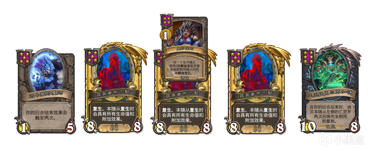 再說一個克爾蘇加德的小技巧,回合結束喫自己想要的復生隨從,即可在場上獲得一張複製,利用這個機制可以實現三連任意亡靈(帶亡語頻率的需要控制好格子),三連以後再用克爾蘇加德喫復生金色隨從可以實現滿場金色,也就是養馬的核心技能,如果用在擠爆流身上,去喫古墓搗蛋鬼,是非常容易成型的。