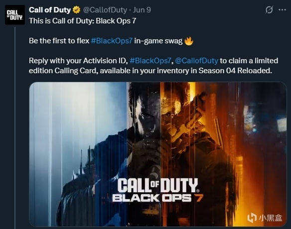 北京時間6月11日3:00前,在官方的這條推文下回復“動視ID#123456 #BlackOps7 @CallofDuty”,自動回覆確認後,即可在第四賽季季中獲得《黑色行動7》預熱名片。