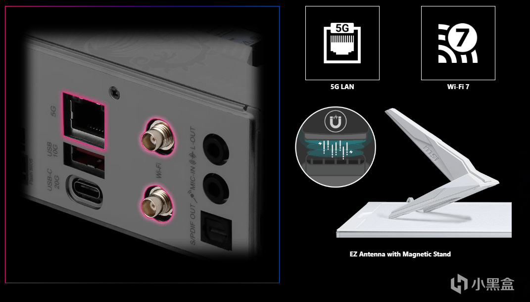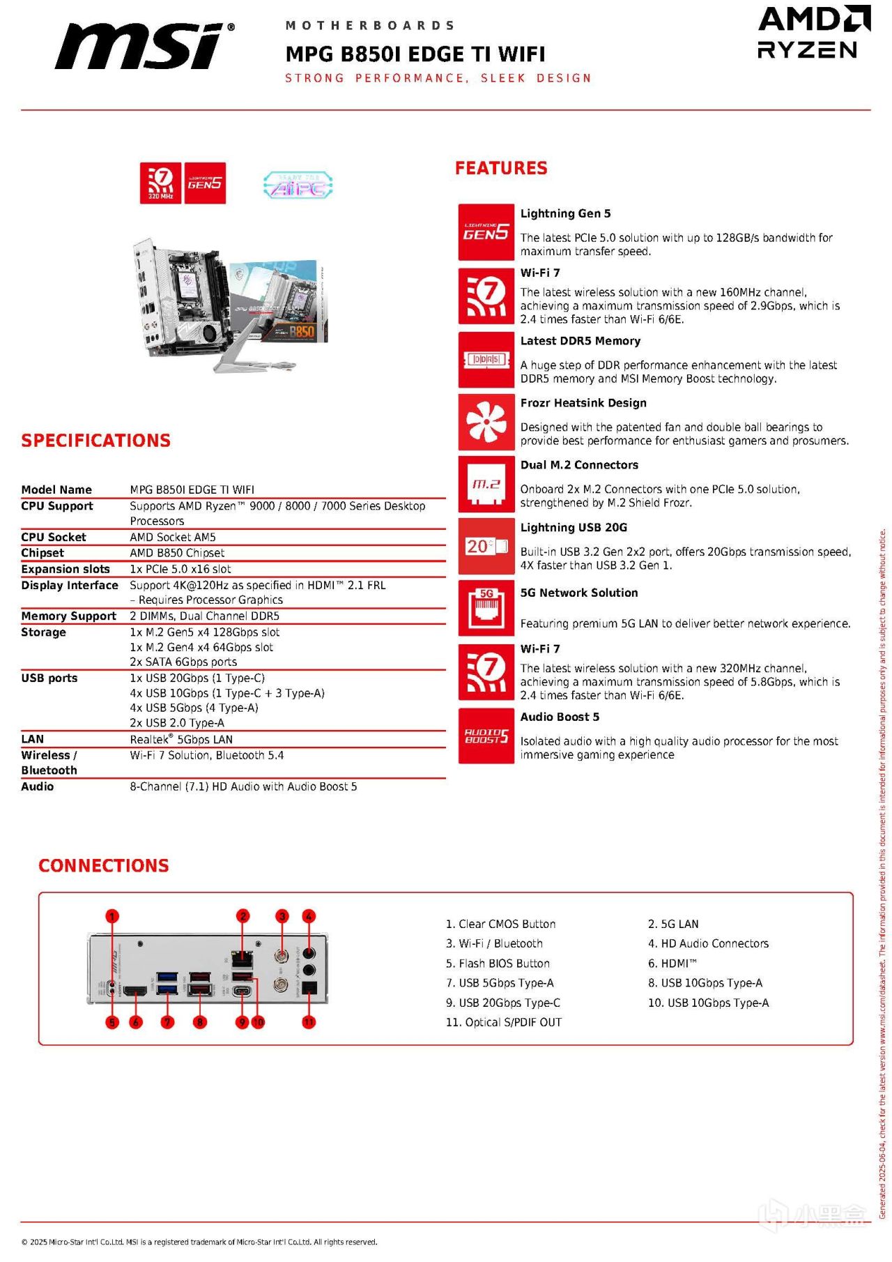 接口方面有20G的雷电口,5G网口,Wi-Fi 7无线网卡,两条DDR5插槽,一条PCIe 5.0 M.2插槽(正面),一条PCIe 4.0 M.2插槽(背面),以及Gen 5 PCIe插槽。