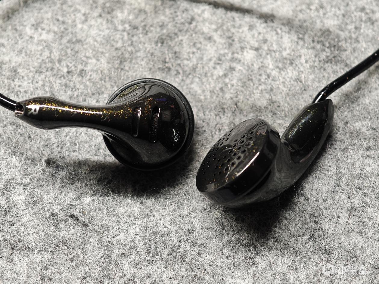 這是一款有線平頭塞耳機,主要用於聽歌使用。整體是黑色的風格,表面烤漆工藝,上面噴了金粉閃點,顏值不錯。