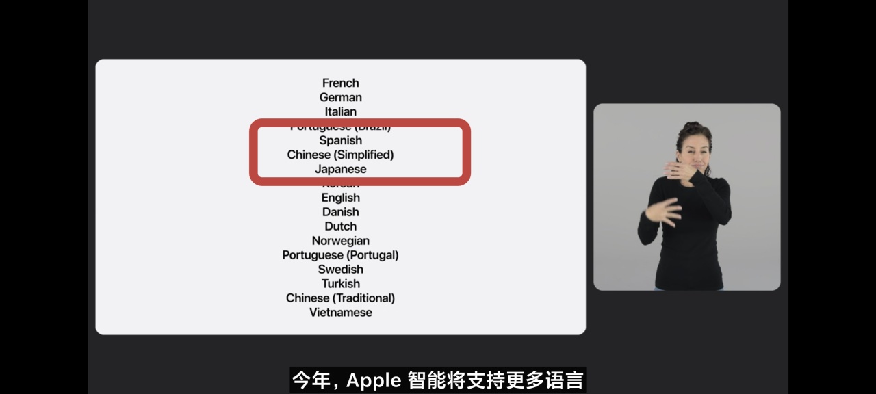 映入眼帘的----苹果ai!今年将支持更多语言,我拿着我的小爱同学自己扫,找到了Chinese (Simplified)iPhone用户听到了吗,今年要上了