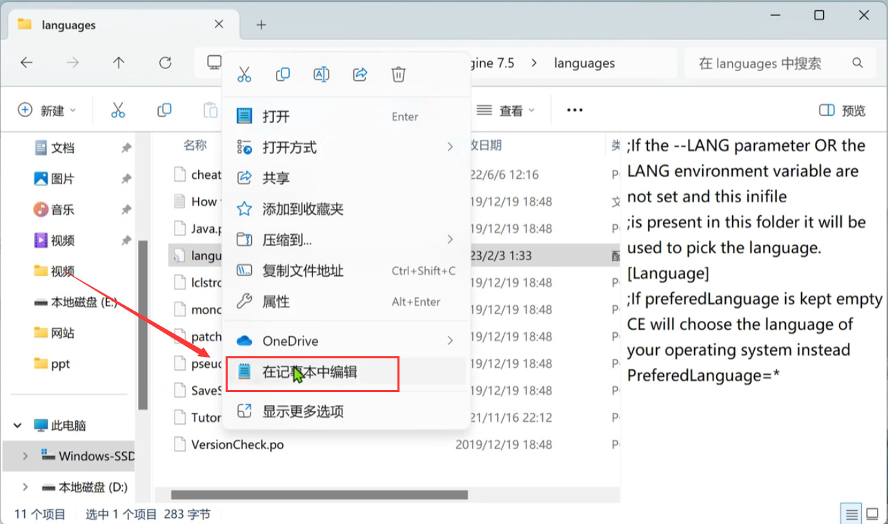 2. 打開後找到lahguage文件 右鍵選擇在記事本中編輯