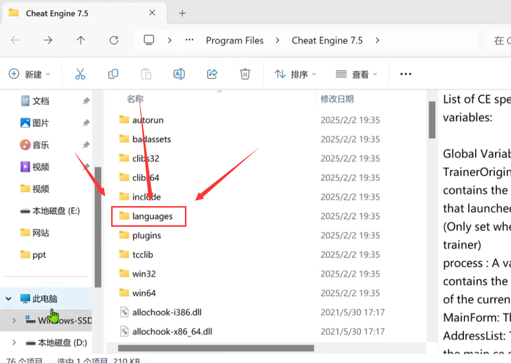 1. 在剛纔的CE主文件夾中找到並打開“languages”文件夾