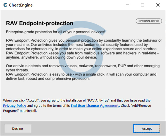 ⚠3. 如果出現了 圖1 和 圖2 這兩個界面 都要點擊左邊的Decline 不要點擊右邊的 不然就下載到流氓捆綁軟件了 拒絕流氓軟件後 CE就算安裝完成了