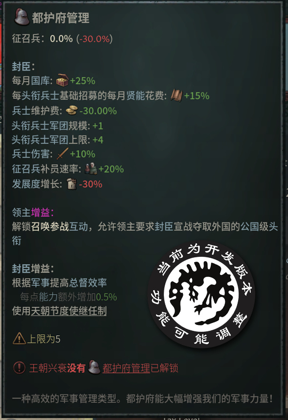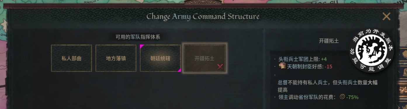 此时天朝拥有更多扩张工具——新的宣战理由、更多军队、科举更注重于带来伟大的军事家,以及解锁专属 “都护府”行政路类型。