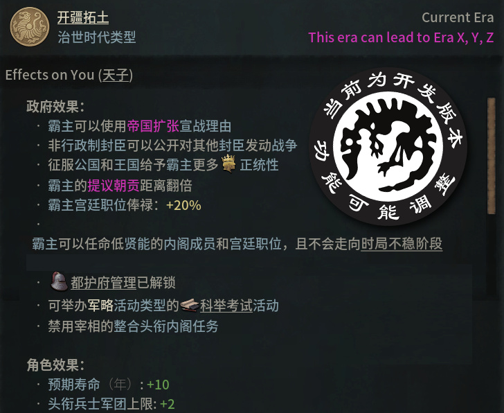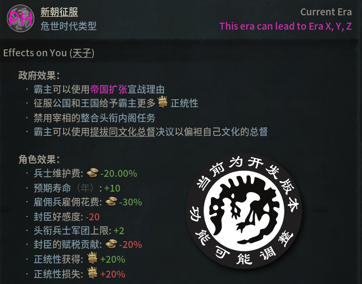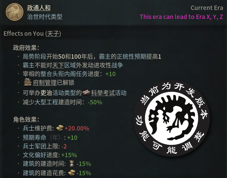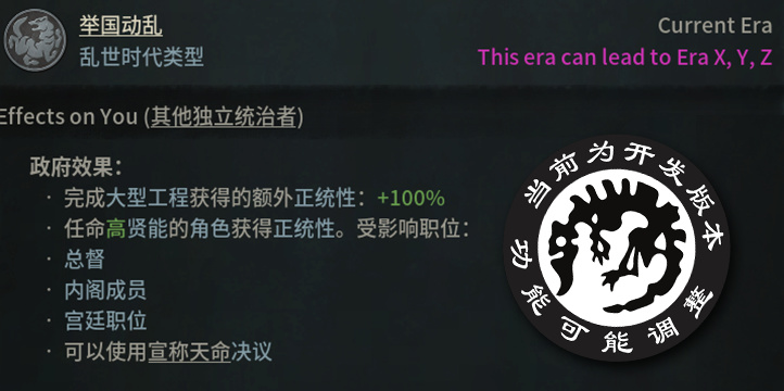 注意:这些影响并非最终结果!我们还在考虑单独创建一个“变法改革”(Reform)危世,以此从某种治世改革为另一种治世,抑或是将这个概念合并进当前这个时代。